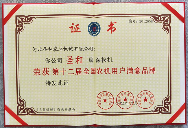 圣和深松機榮獲第十二屆滿意品牌證書