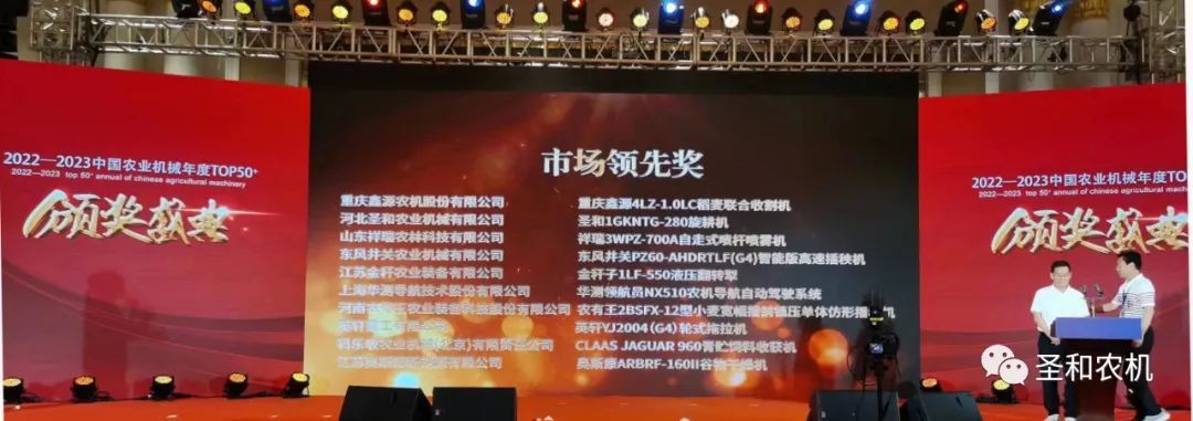 昨日,喜報(bào)又傳,在由中國(guó)農(nóng)業(yè)機(jī)械工業(yè)協(xié)會(huì)、中國(guó)農(nóng)業(yè)機(jī)械學(xué)會(huì)、《農(nóng)業(yè)機(jī)械》雜志社共同舉辦的第十一屆中國(guó)農(nóng)業(yè)機(jī)械高端論壇暨2023中國(guó)農(nóng)業(yè)機(jī)械年度TOP50+頒獎(jiǎng)典禮上,河北圣和農(nóng)業(yè)機(jī)械有限公司在連續(xù)多年獲得TOP50+年度大獎(jiǎng)的基礎(chǔ)上,“圣和1GKNTG-280旋耕機(jī)”憑借遙遙領(lǐng)先的市場(chǎng)表現(xiàn)與客戶高度認(rèn)可的可靠品質(zhì),實(shí)力加冕最具重量級(jí)獎(jiǎng)項(xiàng)——“市場(chǎng)領(lǐng)先獎(jiǎng)”,充分彰顯了圣和旋耕機(jī)家族的冠軍實(shí)力,行業(yè)地位再獲認(rèn)可。